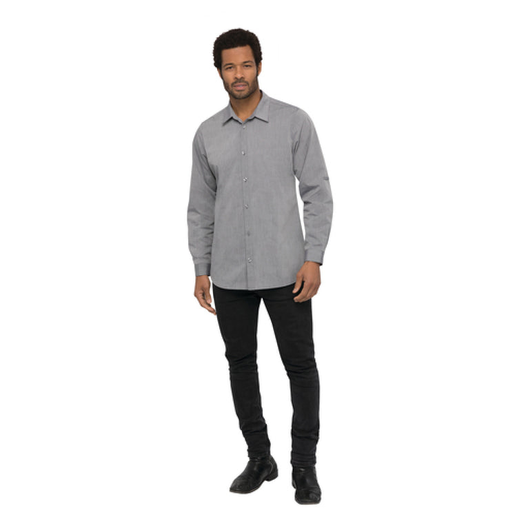 Chef Works, SHC06-GRY-S, Men's Chambray Dress Shirt, roll-up long sleeves with button tab, 2-button cuff, side hem detail, back yoke with pleats, tonal button front closure, modern fit, finish, 65/35 poly/cotton, gray, S