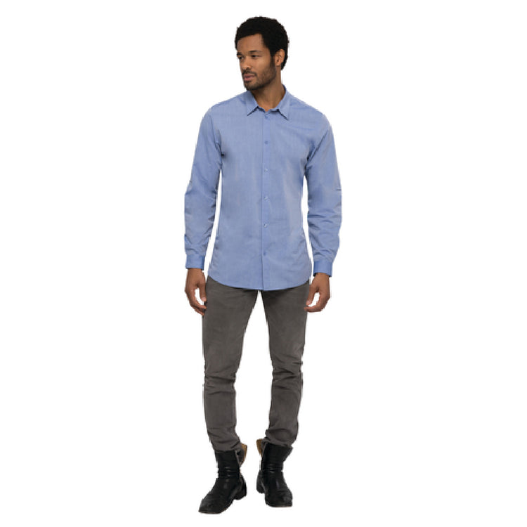 The Chef Works SHC06BLU3XL Men’s Chambray Dress Shirt is a professional-grade cook's shirt designed for commercial foodservice environments. Made from a durable 65/35 polyester/cotton blend, it offers a modern fit suitable for kitchen staff requiring an easy-to-sterilize, stylish uniform. This option features long sleeves with a roll-up function via a button tab, a tonal button-front closure, and back yoke with pleats, providing both mobility and a polished appearance. Its technical specifications ensure consistent wear in demanding culinary settings like banquet kitchens, catering operations, or upscale restaurants. With precise sizing and fabric construction, it supports efficient workflow and sanitation compliance for foodservice professionals.