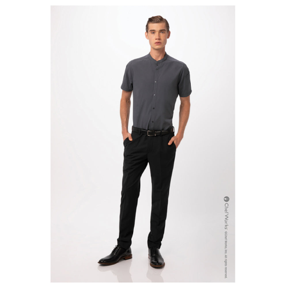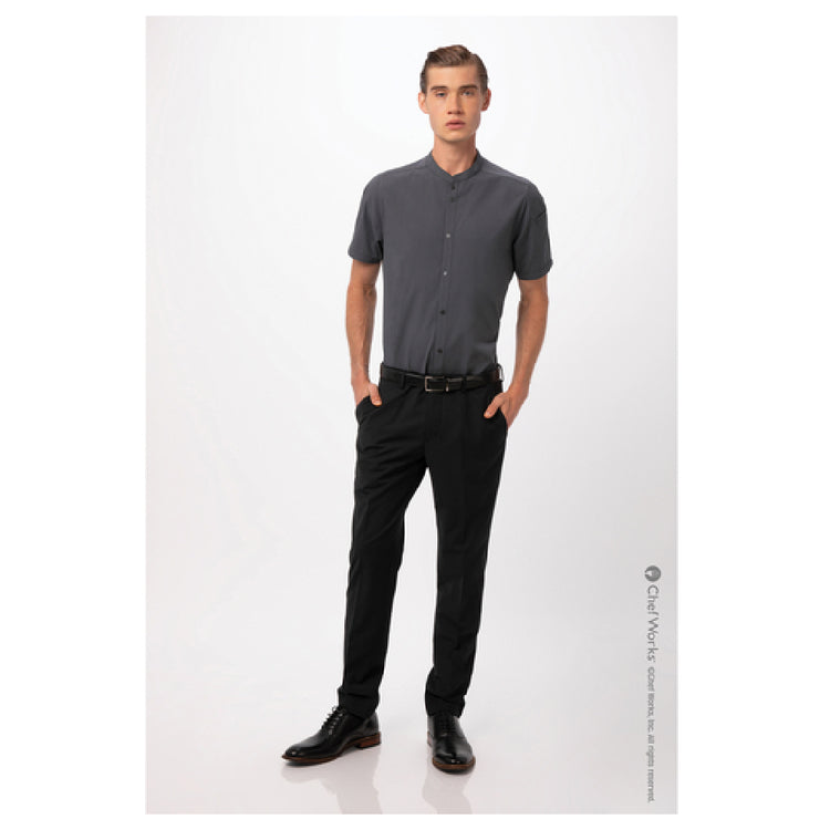 Chef Works, SHC08-CHR-XL, Men's Seersucker Shirt, short sleeves, snap front closure, banded collar with back collar apron holder snap tab, left sleeve inset pocket, back yoke with darts, side seam slits, 65/35 poly/cotton, charcoal, XL