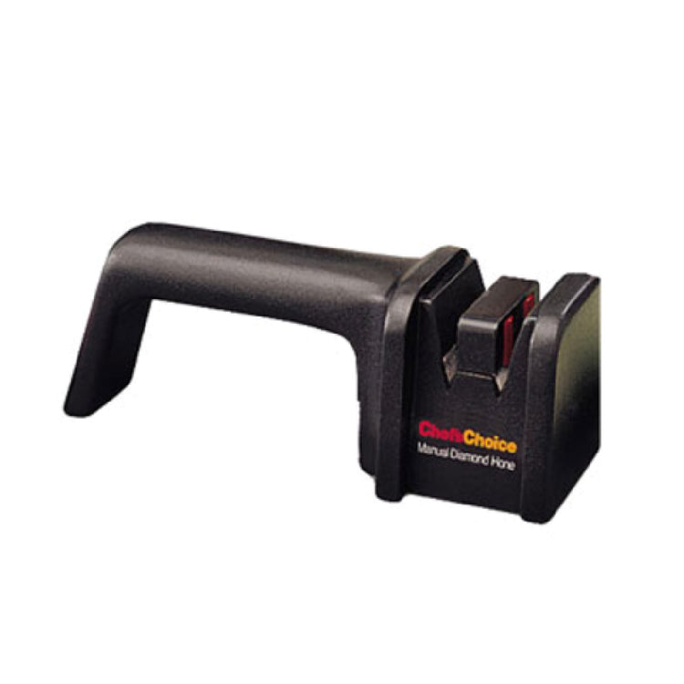 The Chefs Choice 4780100 M478 Chef's Choice® Diamond Hone® Knife Sharpener is a professionally engineered manual two-stage device designed for the precise sharpening of straight blades. Manufactured by Edgecraft in the USA, this tool features 100% diamond abrasives and incorporates precision roller guides to ensure optimal edge alignment. Suitable for both right- and left-handed operators, it is a reliable sharpening solution for commercial kitchens, culinary establishments, and foodservice facilities demanding consistent edge quality and durability from their knives.