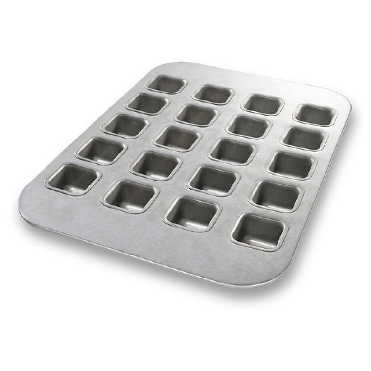 The Chicago Metallic 25300 Brownie Bite Pan is a commercial bakeware item designed for precise, high-volume confectionery production. Crafted from aluminized steel, this bake pan measures 11-1/8" by 15-3/4" overall and facilitates the creation of twenty evenly sized 1-21/32" square brownie bites, each with a capacity of 1.8 ounces. Its curled rim enhances handling durability and ease of use in professional kitchens, while the AMERICOAT® ePlus silicone glaze offers a PFOA-free non-stick surface ideal for producing consistent results. This product exhibits a robust construction suited for benchtop or stationary application within bakery, pastry, or institutional foodservice environments, supporting efficient workflow for batch baking operations.