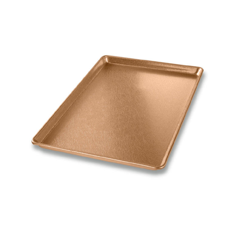 The Chicago Metallic 40930 Display Pan is a professional-grade foodservice accessory designed for commercial bakery, market, and retail display environments. Crafted from durable 16-gauge anodized aluminum with a copper finish, this half-size rectangular tray measures 11-15/16" x 17-15/16" x 13/16", featuring a textured surface and semi-closed rim. Its robust construction ensures even heat distribution, resistance to warping, and longevity in high-usage settings, making it suitable for presenting baked goods, confections, or other pre-portioned items with precision and style. This display pan's technical profile emphasizes its suitability for high-volume merchandising and refrigeration display applications, optimizing product presentation in a variety of foodservice operations.