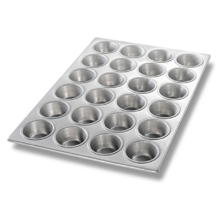 The Chicago Metallic 46525 Muffin Pan is a commercial-grade bakeware item designed for high-volume baking applications. Crafted from durable 14-gauge aluminum with a coated surface, it features a spacious overall dimension of 14-1/8" x 20-3/4" to efficiently produce (24) standard 2-3/4" diameter cakes. Each cavity offers a 3.8 oz. capacity, optimized for uniform heat conduction and consistent product outputs in busy foodservice environments. The wire-in rim enhances stability during handling, making it suitable for professional bakeries, catering operations, and high-output kitchens seeking reliable, long-lasting bakeware for multi-batch production.