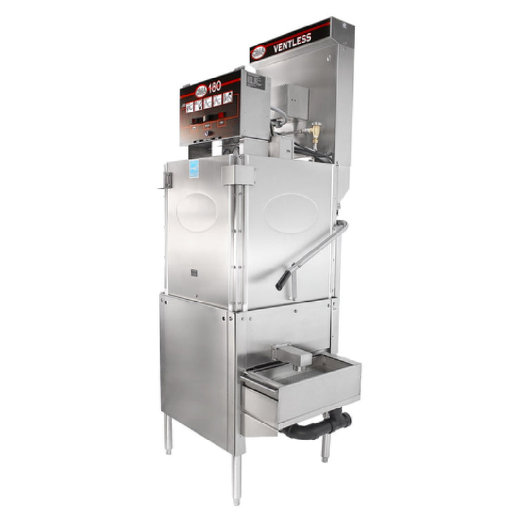 This model distinguishes itself through its ventless operation combined with high-temperature sanitizing and stainless steel construction, improving sanitation and durability compared to typical commercial dishwashers. Its universal design allows flexible installation in various kitchen layouts, while the integrated heat recovery system reduces energy consumption, enhancing operational efficiency in high-demand environments.