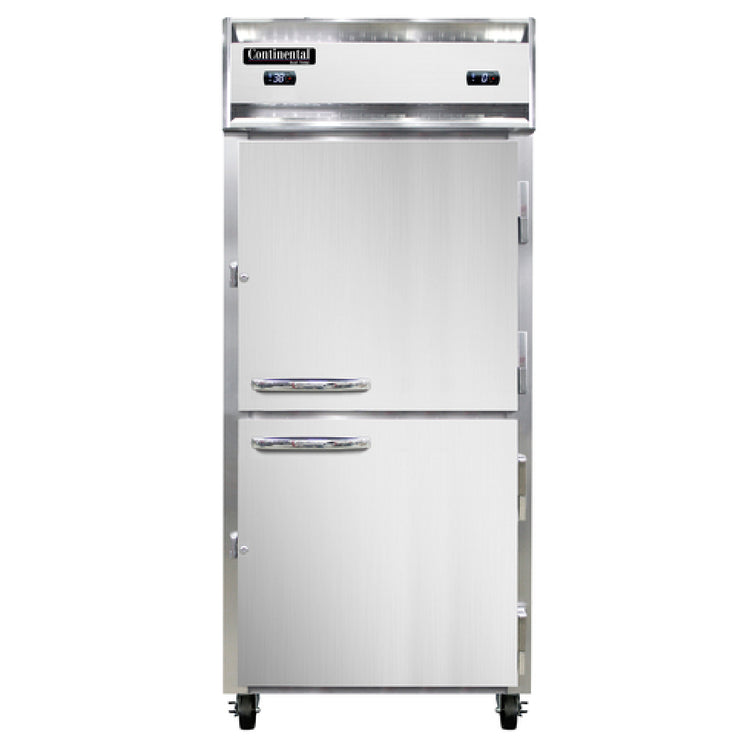 The Continental Refrigerator 1RFXNSAHD Extra-Wide Refrigerator/Freezer Reach-in 36-1/4"W is a commercial-grade refrigeration unit designed for high-efficiency storage in foodservice environments. This single-section, reach-in model features a spacious interior with aluminum lining and epoxy-coated steel shelves, optimized for quick access and organization. Its self-contained refrigeration system utilizes R290 hydrocarbon refrigerant, ensuring environmentally conscious operation while maintaining precise temperature control with an exterior digital thermometer. The unit's over/under hinged doors are equipped with self-closing mechanisms, lock cylinders, and wide, solid construction, ideal for mid-volume food storage. With standard depth dimensions, a robust stainless steel exterior, and dual 1/4 & 1/3 HP compressors, it delivers dependable cooling performance suitable for restaurant kitchens, cafeteria lines, and institutional facilities. Its adjustable freezer can operate as low as -10°F, providing versatile frozen storage solutions within a compact footprint, measuring 36-1/4 inches wide.