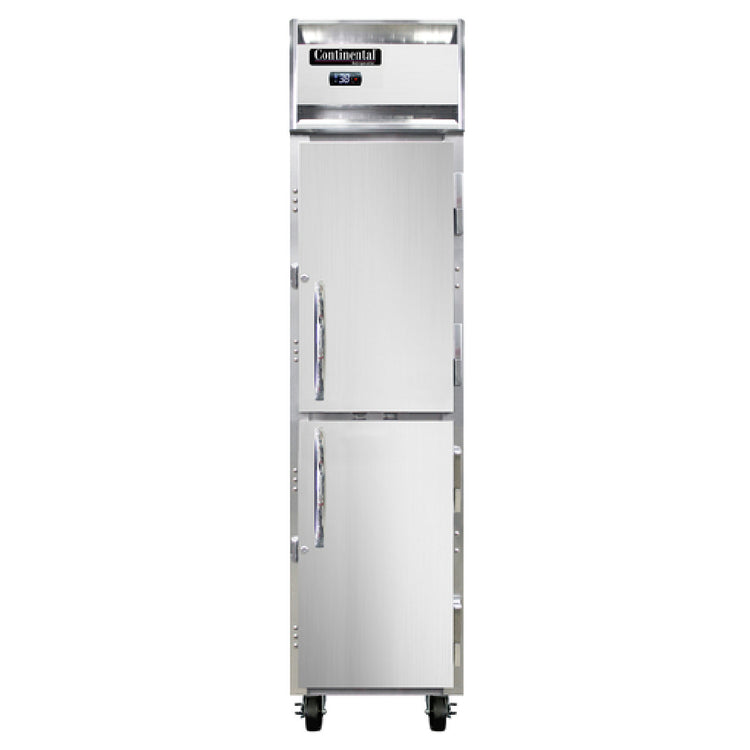 The Continental Refrigerator 1RSENSSHD Slim Line Refrigerator Reach-in is a compact, professionally designed commercial refrigeration unit tailored for precise storage needs in foodservice environments. Measuring 17-3/4 inches in width, it features a one-section, self-contained refrigeration system with a top-mounted compressor and all stainless steel interior and exterior. The unit's half-height solid door with cylinder locks enhances security and ease of access, while the digital electronic control panel provides accurate temperature management. Designed for reliable operation, it incorporates a hydrocarbon R290 refrigerant for environmentally conscious cooling, ensuring consistent storage conditions within its specified parameters.