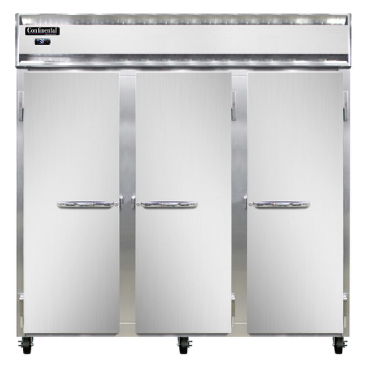 A commercial reach-in refrigerator is a heavy-duty refrigeration unit designed for quick access and storage of perishable foods in professional foodservice settings. The Continental Refrigerator 3RN model provides three solid doors with full-height access, featuring self-contained, top-mounted hydrocarbon refrigeration for rapid cooling and even temperature distribution. It is typically installed in restaurant kitchens, cafeterias, and catering operations, with precise temperature controls and durable construction, making it suitable for environments with moderate throughput and strict food safety standards.