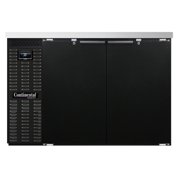 Continental Refrigerator, BB50N, Refrigerated Back Bar Cooler, 50"W, 34-3/4"H, 16.0 cu. ft., front breathing, stainless steel top, (2) doors with locks, electronic controller with digital display & hi-low alarm, black enamel finish exterior, stainless steel interior back & side panels with reinforced stainless steel floor, epoxy coated steel shelves, self-contained refrigeration, R290 hydrocarbon refrigerant, 1/4 HP, cETLus, NSF