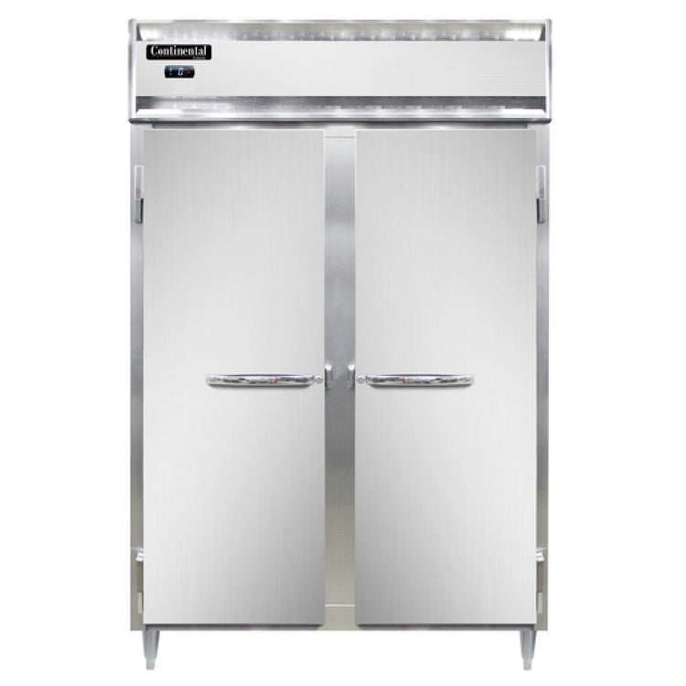 The Continental Refrigerator D2FN model operates with a 1/2 HP compressor powered by a standard electrical supply, typically 115V, 60Hz, single-phase, with amperage and wattage specific to the unit's refrigeration load. It features self-contained, air-cooled refrigeration with R290 hydrocarbon refrigerant, ensuring energy-efficient cooling with a typical power consumption compatible with commercial kitchen standards. The internal capacity is 50.0 cu. ft., divided into two sections, optimized for frozen storage of various food items in bulk. The exterior finish is stainless steel on the front and aluminum on sides, with interior all aluminum for corrosion resistance and ease of cleaning. The unit measures 83.25 inches in height, 52 inches wide, and 35.38 inches deep, weighing approximately 570 lbs. It operates within specified temperature ranges suitable for frozen products, and construction materials comply with food safety standards. The reach-in design includes full hinged solid doors secured with cylinder locks, with 6-inch stainless steel legs providing stability. It features digital electronic controls with a digital display and hi-low alarms, supporting efficient operation and monitoring in busy commercial kitchens.