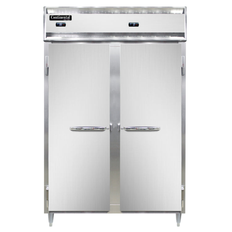 A commercial refrigerator freezer is a building-grade appliance designed to store perishable foods at precise, consistent temperatures necessary for food safety and quality. The Continental Refrigerator D2RFN is a two-section reach-in model with self-contained refrigeration, built with durable stainless steel fronts and aluminum interiors suitable for high-demand foodservice operations. It features reliable dual compressor units, digital temperature control, and hinged doors, making it ideal for kitchens, cafeterias, and grocery stores that require robust, easy-to-maintain refrigeration for bulk storage of critical food products.