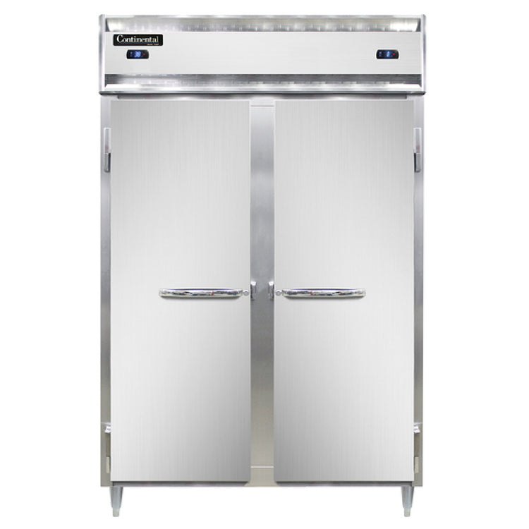 The Continental Refrigerator D2RFSN features a compact width of 52 inches, height of 83.25 inches, and depth of 29.5 inches, with a total weight of approximately 580 pounds, supporting sturdy installation in professional kitchens. Its refrigeration system is self-contained with air-cooled condensation, powered by dual 1/4 and 1/2 HP compressors mounted at the top for optimal circulation. The unit employs environmentally friendly R290 hydrocarbon refrigerant, contributing to energy-efficient operation with minimal environmental impact. Constructed with stainless steel doors and aluminum interior, it maintains operational temperatures within the safe range for perishable food storage. The refrigerator includes hinged solid doors with cylinder locks for security and easy maintenance, with dimensions designed for tight space integration. It operates on standard commercial electrical requirements and features a shallow depth for versatile placement. Additional technical elements include an exterior digital thermometer, NSF and cETLus listings, and a product manual for installation and maintenance guidance.