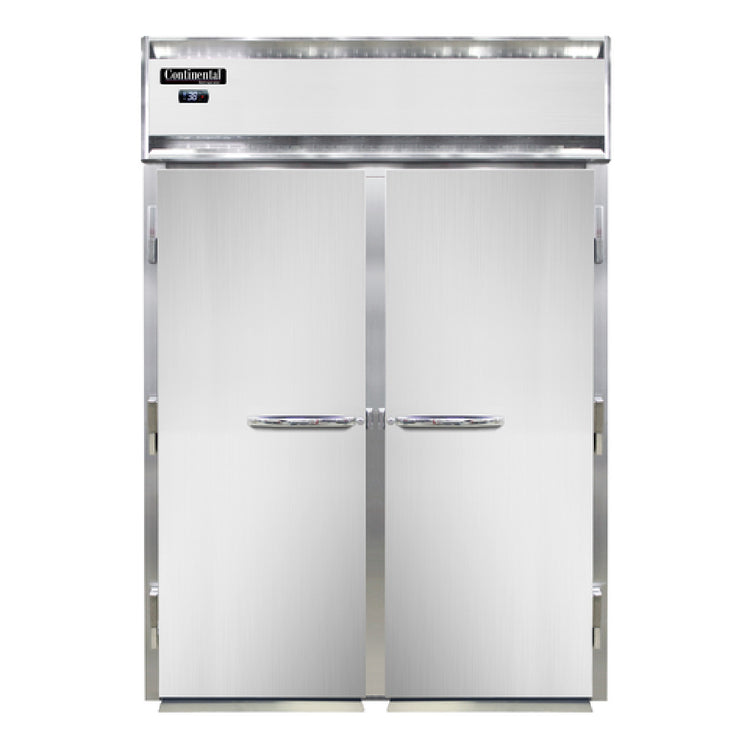 The Continental Refrigerator D2RINSS-E Designer Line Extra-High Refrigerator Roll-in is a commercial-grade, two-section refrigerator engineered for precise temperature control and durability in high-demand foodservice environments. This model features self-contained refrigeration with R290 hydrocarbon refrigerant, providing eco-friendly cooling with a 1/2 HP compressor. Its stainless steel exterior and interior ensure robust sanitation and resistance to corrosion, while the full-height solid doors with cylinder locks enhance security and ease of access. With a standard depth cabinet and digital electronic controls including a hi-low alarm, this unit offers reliable operation and straightforward maintenance in busy kitchens requiring efficient walk-in capabilities.