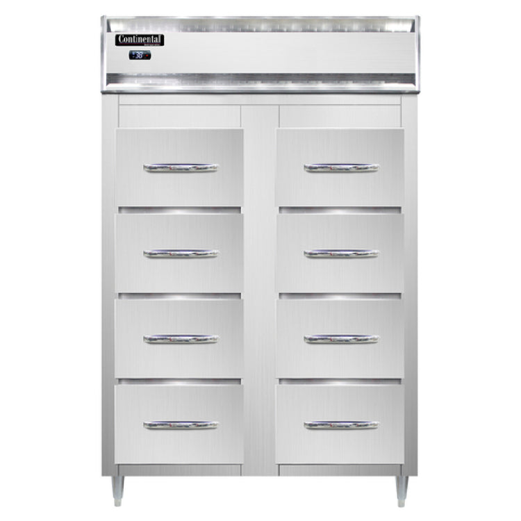 The Continental Refrigerator D2RSNSS-F Designer Line Refrigerator Fish/poultry File is a professional-grade vertical refrigerated cabinet designed specifically for the storage of fish and poultry products in commercial foodservice environments. This model features a two-section layout with (8) drawers, self-contained refrigeration, and a durable construction of 300 series stainless steel both interior and exterior. Equipped with electronic control with a digital display, it allows precise temperature management, while the hi-low alarm ensures optimal food safety. Powered by a 1/3 HP compressor using environmentally friendly R290 hydrocarbon refrigerant, this refrigerator offers reliable operation suited for high-volume kitchens. Its robust build and technical features optimize workflow efficiency and product presentation, making it an essential component of seafood markets, commercial kitchens, and catering operations requiring organized, safe storage for delicate proteins.