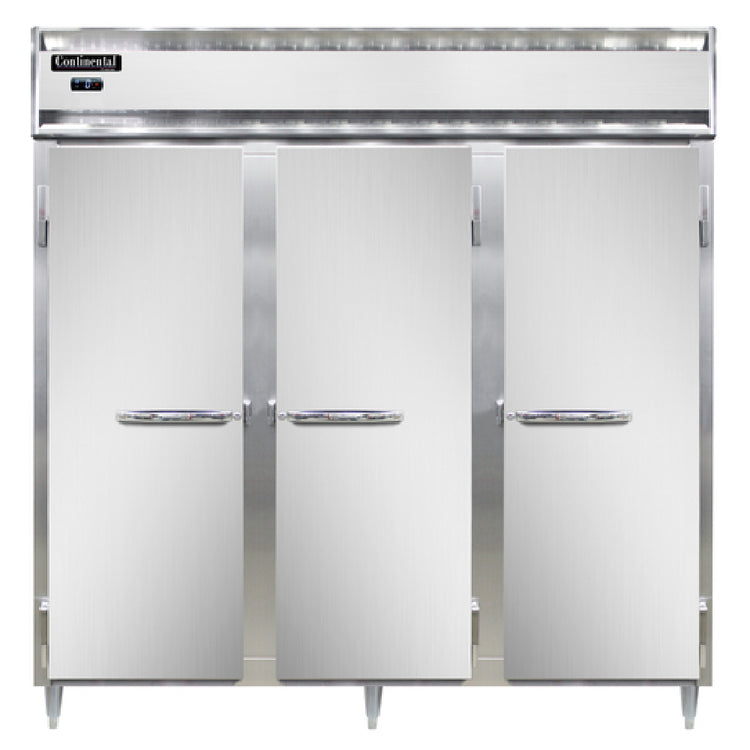 The Continental Refrigerator DL3F Designer Line Freezer Reach-in Three-section is a professional-grade commercial freezer designed for high-efficiency food storage in restaurant, café, and institutional settings. This three-section reach-in unit features a 72.0 cubic foot capacity, ensuring ample storage for perishable ingredients. Equipped with self-contained, top-mounted refrigeration, it maintains consistent temperatures within a robust all-aluminum interior and an stainless steel front, optimizing durability and sanitation. The model incorporates full hinged solid doors with cylinder locks for security, digital electronic controls with a clear display, and a hi-low alarm system for optimal safety. With dimensions of 78" width, 83.25" height, and 35.38" depth, this unit is built for professional kitchens requiring reliable, large-volume freezing capabilities, and is rated for demanding commercial environments.