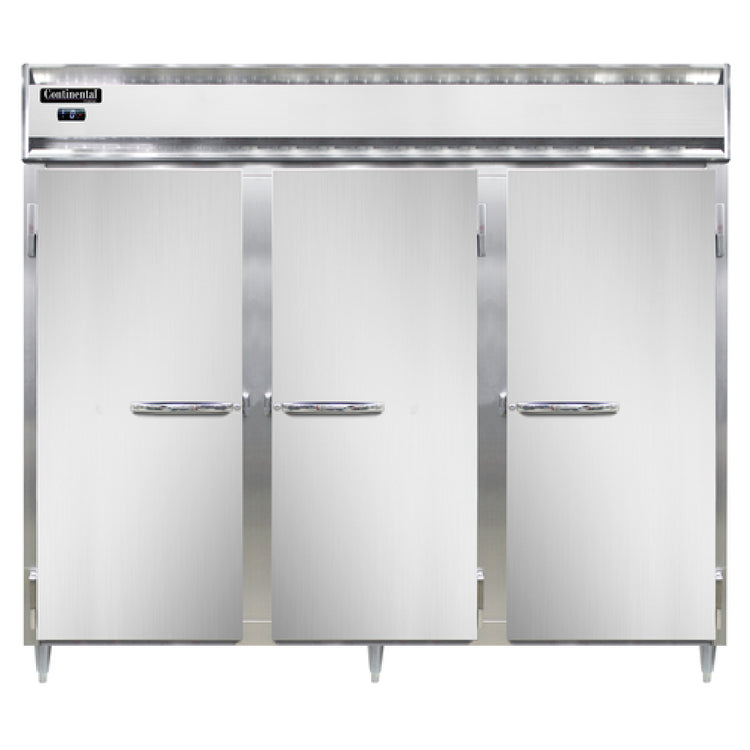 A commercial reach-in freezer is a refrigeration appliance designed for high-capacity frozen food storage within professional kitchens, cafeterias, or foodservice establishments. These units feature multiple full-height solid doors and a durable construction to withstand daily use. The Continental Refrigerator DL3FE delivers a three-section configuration with self-contained, top-mounted refrigeration optimized for medium workload environments. It is primarily used in large-scale foodservice operations such as restaurants, cafeterias, and institutional kitchens that require reliable, accessible frozen storage with precise temperature control to ensure food safety and operational efficiency.