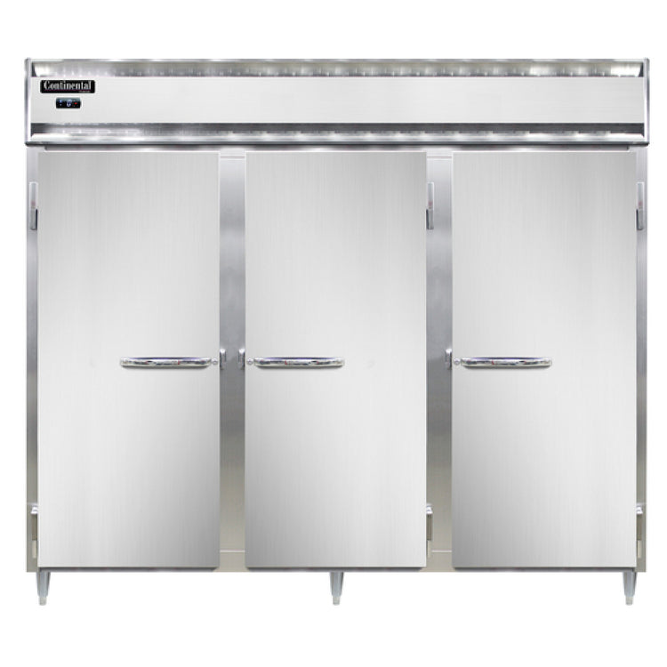 Continental Refrigerator, DL3FE-SS, Designer Line Wide Freezer, reach-in, 85-1/2"W, three-section, self-contained refrigeration, stainless steel exterior & interior, standard depth cabinet, wide full-height solid doors, cylinder locks, electronic control with digital display, hi-low alarm, 6" stainless steel legs, 3/4 HP, cETLus, NSF