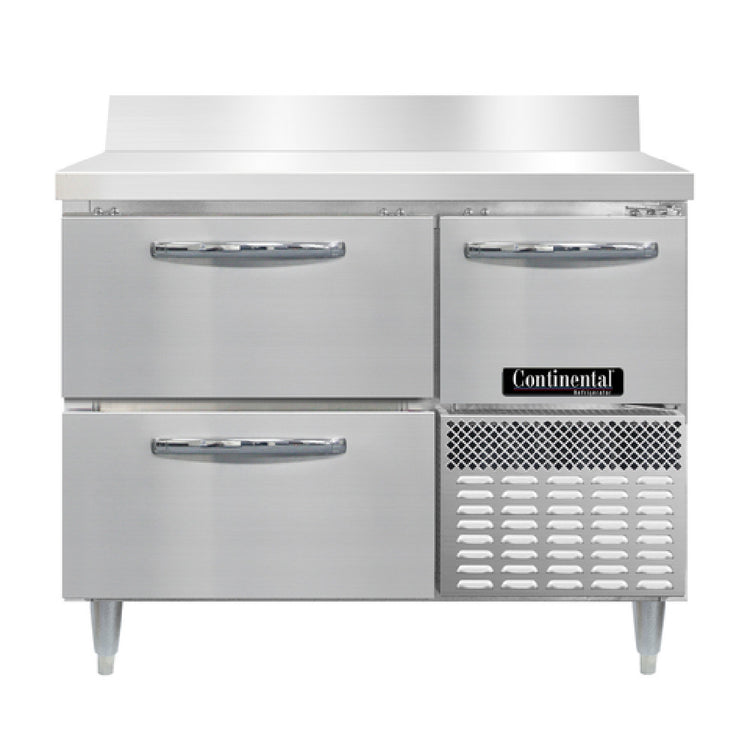 Continental Refrigerator, DRA43NSSBS-D, Designer Line Refrigerated Base Worktop Unit, 43"W, reinforced stainless steel work top with 6"H backsplash, stainless steel exterior, front, sides & interior, (2) drawers & (1) half height field rehingeable door, 6" adjustable stainless steel legs, electronic control, off-cycle defrost, 1/4 HP, side-mounted refrigeration, R290 hydrocarbon refrigerant, cETLus, NSF