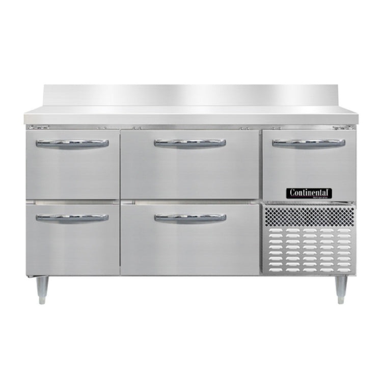 The Continental Refrigerator DRA60NSSBS-D Designer Line Refrigerated Base Worktop Unit is a commercial-grade refrigeration solution designed for precise food storage and preparation in professional kitchens. This 60" wide refrigerated worktop features a reinforced stainless steel work surface with a 6-inch high backsplash, providing durability and easy cleaning. Its side-mounted refrigeration system employs R290 hydrocarbon refrigerant, ensuring energy-efficient cooling. The unit includes two spacious drawers capable of holding four 12 x 20 x 6 pans (supplied separately), along with two narrower drawers for additional storage, and a half-height field rehingeable door for versatile access. Built with stainless steel exterior, interior, and front, it combines construction quality with industry-standard refrigeration performance, suitable for high-demand foodservice environments requiring reliable temperature control and ergonomic design. The self-contained cooling system operates at 1/4 HP, with electronic controls and off-cycle defrost, making it ideal for streamlined kitchen workflows needing consistent refrigeration in a compact footprint.