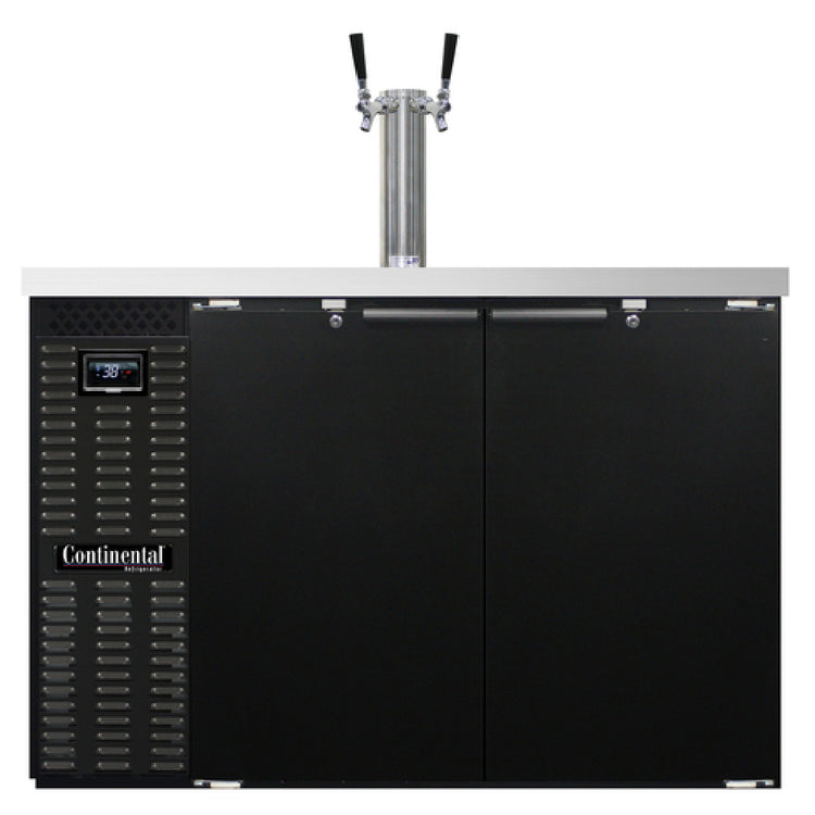 The Continental Refrigerator KC50N Keg Cooler 50"W 16.0 Cu. Ft. is a commercial draft beer cooler engineered for professional foodservice environments requiring reliable beverage storage and dispensing. Featuring a 50-inch width and a robust 16.0 cubic feet capacity, this unit provides efficient storage with dedicated space for two straight-wall kegs. Its self-contained refrigeration utilizes environmentally friendly R290 hydrocarbon refrigerant, ensuring consistent temperature control within the operating range. The unit's durable stainless steel interior back and sides, reinforced stainless steel floor, and black enamel exterior form a corrosion-resistant, easy-to-maintain structure suitable for high-demand hospitality operations. Equipped with electronic controls, a digital display, and hi-low alarms, it facilitates precise temperature management, critical for optimal draft beer presentation and quality maintenance. Its front breathing design allows for streamlined installation and optimal airflow, making it ideal for busy commercial bars and restaurant kitchens.