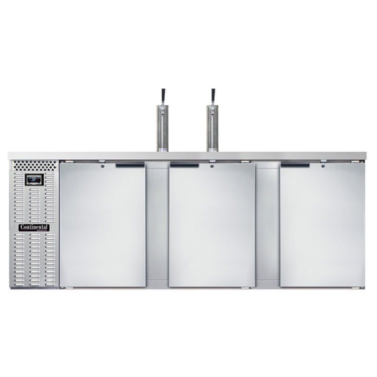 The Continental Refrigerator KC90NSS Keg Cooler is a commercial-grade draft beer cooler designed for high-performance beverage storage in hospitality environments. Featuring a 90-inch width and a 35.0 cubic foot capacity, this unit optimizes keg storage with its front breathing refrigeration system. Equipped with (4) barrel or (5) straight wall keg capacity, it ensures efficient and organized handling of beverages. The model boasts a stainless steel exterior and interior back and side panels reinforced with durable stainless steel flooring, providing longevity in demanding foodservice settings. Its electronic controller with digital display, integrated hi-low alarm, and lockable three doors facilitate precise temperature management and security. With self-contained R290 hydrocarbon refrigerant technology, this unit guarantees energy-efficient cooling suited for professional kitchens and bar setups.