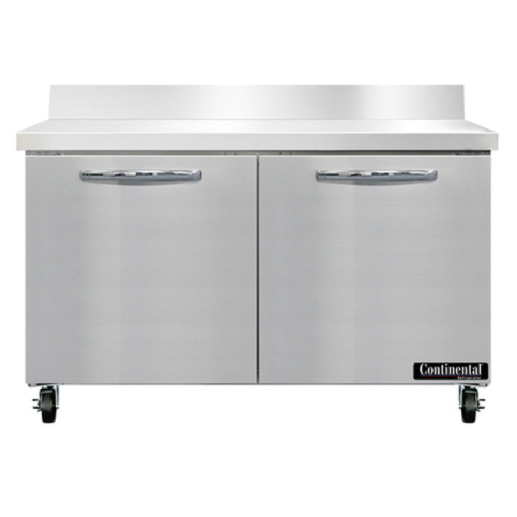 The Continental Refrigerator SW48NBS Work Top Refrigerator is a commercial-grade refrigerated counter designed for high-performance foodservice environments. Featuring a 48-inch width and a 13.4 cubic foot capacity, this two-section unit offers precise temperature control through rear-mounted self-contained hydrocarbon refrigeration using R290 refrigerant. Its durable stainless steel top with a 5-1/2-inch backsplash provides an easy-to-clean surface ideal for food prep stations, while the aluminum interior ensures corrosion resistance. With hingeable doors for versatile access, this model facilitates streamlined workflow in busy kitchens requiring reliable refrigeration solutions for perishable ingredients stored at safe temperatures.