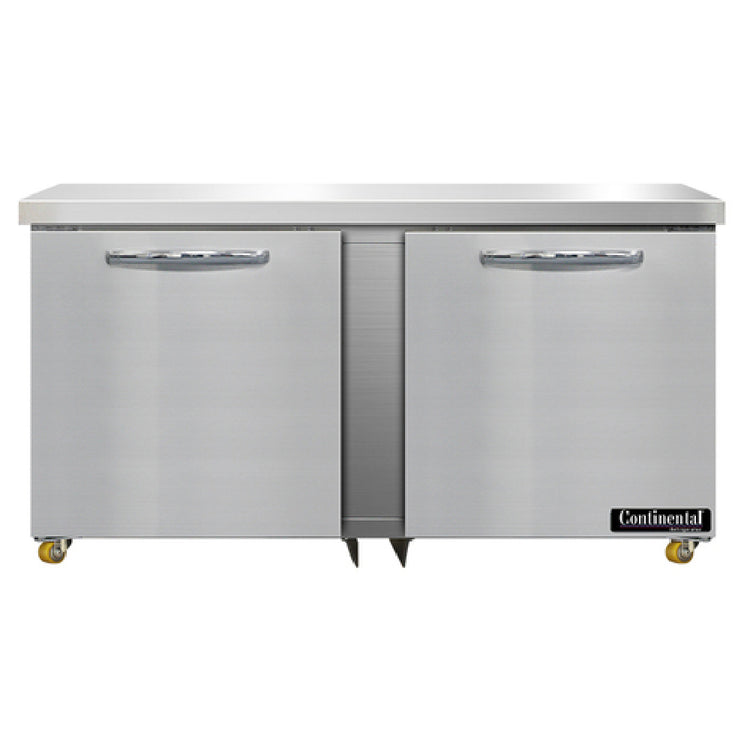 The Continental Refrigerator SW60N-U Undercounter Refrigerator is a commercial-grade, two-section refrigeration unit designed for high-efficiency cold storage in professional foodservice environments. Measuring 60 inches in width and offering a 17.0 cubic foot capacity, this unit features rear-mounted, self-contained refrigeration utilizing R290 hydrocarbon refrigerant for optimal cooling performance and energy efficiency. Its stainless steel front, top, and end panels provide corrosion resistance and durability, while the aluminum interior ensures ease of cleaning and longevity. Equipped with two field-rehingeable hinged doors and 1-3/8" diameter plate casters for mobility, the SW60N-U is suitable for undercounter applications in busy kitchens requiring consistent temperature control and streamlined workflow integration.