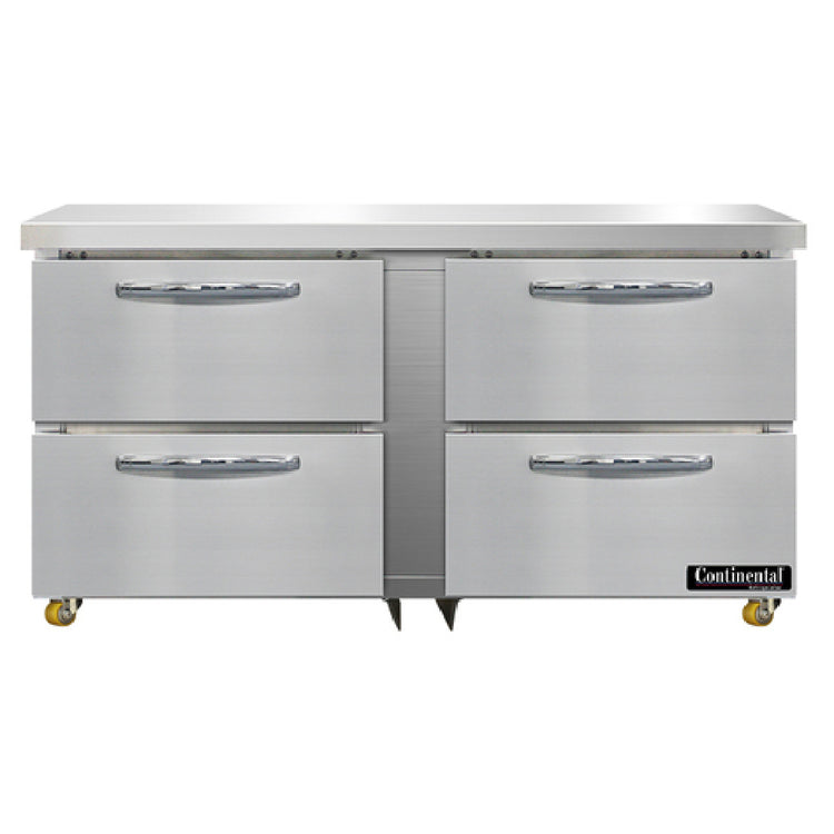 The Continental Refrigerator SW60N-U-D offers a commercial undercounter refrigeration solution equipped with four drawers, ideal for efficient food storage in moderate-volume kitchens. Designed with corrosion-resistant stainless steel and a rear-mounted self-contained cooling system, it provides rapid access and simple maintenance. Its aluminum interior ensures longevity, while 1-3/8" plate casters facilitate mobility within busy setups. Perfect for restaurant prep stations and compact foodservice environments, it delivers consistent temperature control with high durability for daily use.