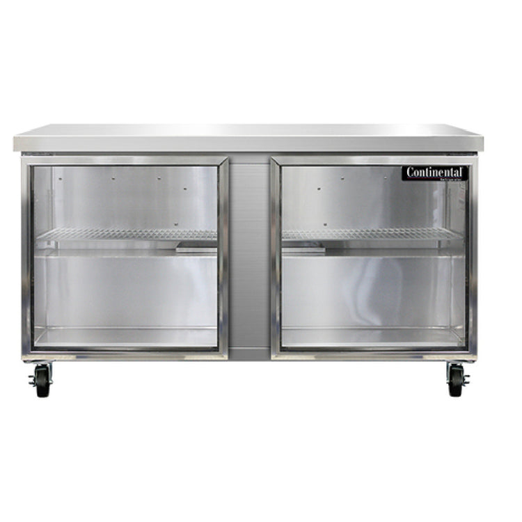 The Continental Refrigerator SW60NGD Work Top Display Refrigerator is a professional-grade refrigerated counter designed for commercial foodservice environments requiring durable, easy-to-maintain display solutions. Measuring 60 inches wide with a 17.0 cubic foot capacity, this two-section model features a stainless steel flat top surface and energy-efficient rear-mounted refrigeration that utilizes R290 hydrocarbon refrigerant. Built with stainless steel front and end panels, along with an aluminum interior, it offers optimal durability and corrosion resistance for high-volume use. The refrigeration system, powered by a 1/5 HP compressor, provides reliable thermal performance, while the glass doors facilitate product visibility in busy kitchen or retail settings. The combination of precise temperature control and robust construction makes the SW60NGD suitable for professional applications that demand consistent product presentation and ease of access.