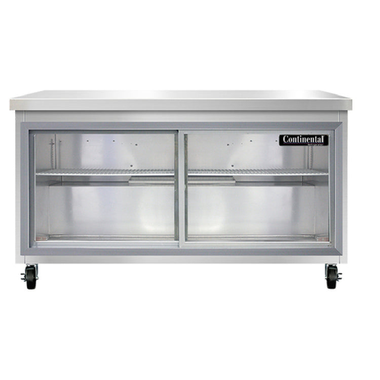 Continental Refrigerator, SW60NSGD, Work Top Display Refrigerator, 60"W, 17.0 cu ft capacity, two-section, stainless steel flat top, (2) sliding glass doors, LED interior lighting, stainless steel front & end panels, aluminum interior, rear mounted self-contained refrigeration, R290 Hydrocarbon refrigerant, 1/4 HP, cETLus, NSF