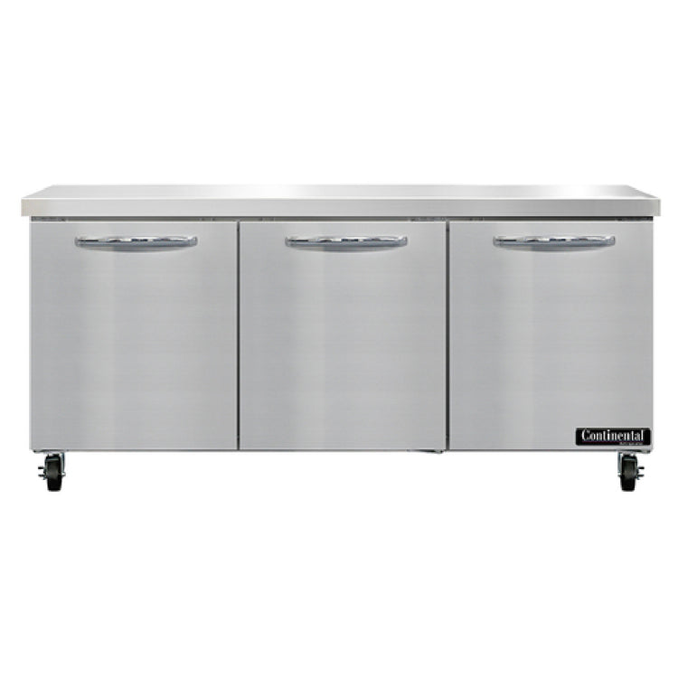 Continental Refrigerator, SW72N, Work Top Refrigerator, 72"W, 20.6 cu ft capacity, three-section, stainless steel flat top, (3) field rehingeable doors, stainless steel front & end panels, aluminum interior, rear mounted self-contained refrigeration, R290 Hydrocarbon refrigerant, 1/5 HP, cETLus, NSF, ENERGY STAR®