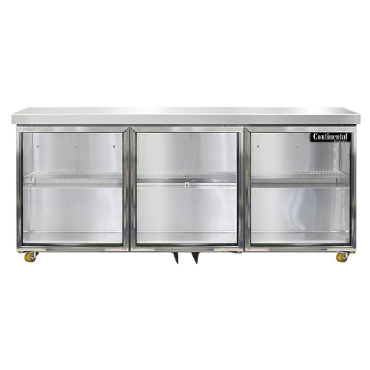 A commercial reach-in undercounter refrigerator is a professionally designed cold storage unit optimized for quick access and efficient refrigeration in high-demand foodservice operations. These units, including models like the Continental Refrigerator SW72NGD-U, feature durable construction, precise temperature control, and ample storage capacity for perishable ingredients. Typically installed in undercounter or prep areas, they support seamless workflow and product presentation in restaurants, cafeterias, and convenience stores. The SW72NGD-U offers a three-section, glass door configuration with LED lighting, making it suitable for mid-volume applications requiring reliable cold storage with easy visibility and access to stored items.