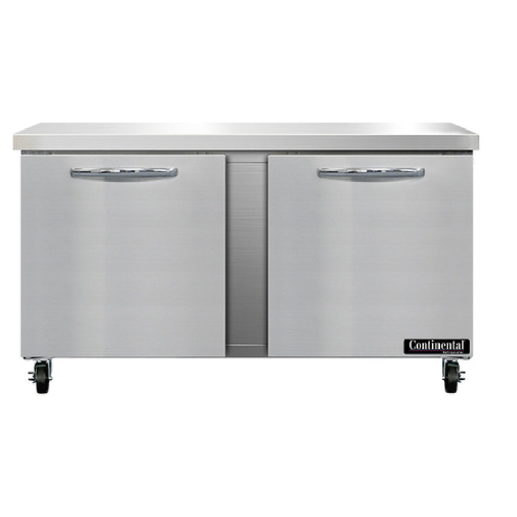 A commercial work top freezer is a refrigerator unit designed for use in professional foodservice environments to provide accessible frozen storage while maximizing workspace. It features a compact footprint with a stainless steel flat top, aluminum interior, and hinged doors for easy access and cleaning. The Continental Refrigerator SWF60N is a model of this category, ideal for fast-paced kitchens requiring reliable, sanitary, and efficient freezing solutions. Such units are primarily installed in prep stations, cafeterias, or food trucks to support moderate throughput of frozen food storage, ensuring seamless workflow integration in various foodservice operations.