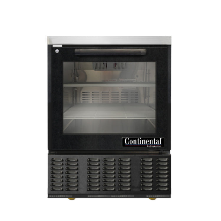 Continental Refrigerator, UCF24SNGD-B, Undercounter Freezer, shallow depth, 24" W, 3.3 cu. ft. capacity, one section, (1) hinged glass door, front breathing, rear mounted self-contained refrigeration, stainless top, baked black enamel finish exterior, aluminum interior, 1-3/8" diameter caster plates, R290 Hydrocarbon refrigerant, 1/5hp, cETLus, NSF