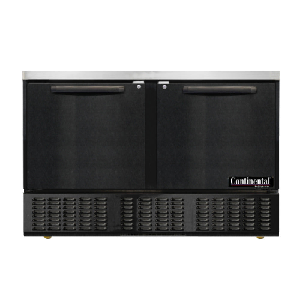 Continental Refrigerator, UCF48SN-B, Undercounter Freezer, shallow depth, 48"W, 7 cu. ft. capacity, two section, (2) field rehingable doors, front breathing, rear mounted, self-contained refrigeration, stainless top, baked black enamel finish exterior, aluminum interior, 5" diameter plate casters, R290 Hydrocarbon refrigerant, 1/4hp, cETLus, NSF