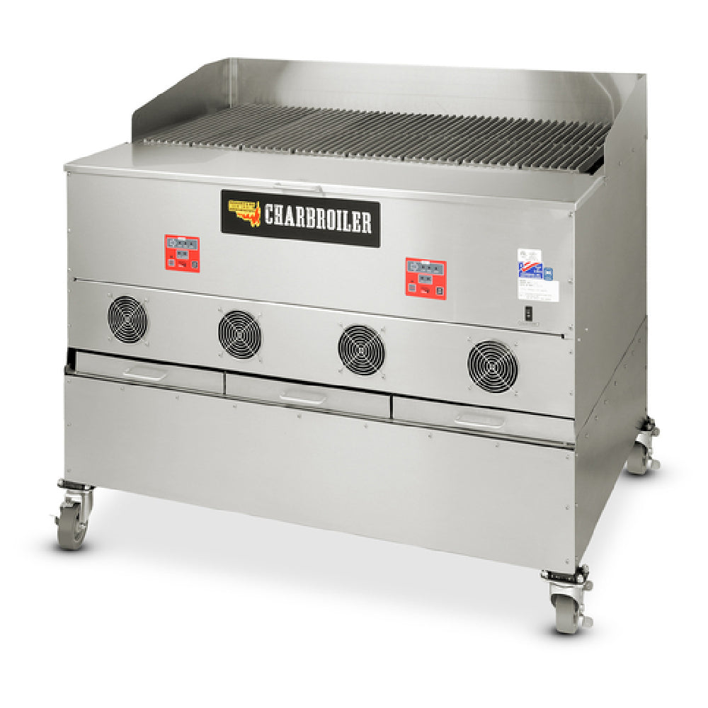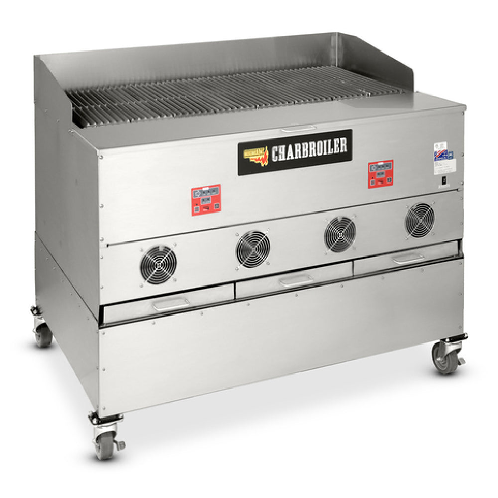 The Cookshack CB048 Charbroiler operates on 120V electrical supply with a current draw of 11 amps. It features an all stainless steel exterior with dimensions of 50-1/2" W x 36" D x 42" H, and weighs 790 pounds for sturdy, stable operation. The unit’s construction is designed with durability and sanitation in mind, utilizing high-quality materials and finishes. Its temperature range from 250°F to 700°F supports diverse cooking techniques, including smoking, searing, and finishing. The product is equipped with two digital controllers for independent zone management, four firepots for efficient heat generation, and an 80-pound hopper for sustained operation. The unit is NSF and cETLus certified, ensuring compliance with commercial kitchen standards.