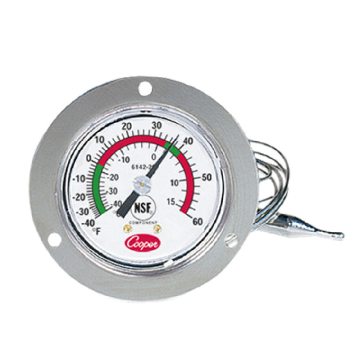 The Cooper Atkins 6142-20-3 Thermometer is a precision measurement tool designed for professional foodservice environments. As part of the Cooper-Atkins line of thermometers, this 2" panel-type device features a sturdy 3" (7.62cm) front flange and a 5/16" (8mm) bulb diameter, enabling accurate temperature monitoring in commercial kitchens. Operating within a temperature range of -40°F to 60°F (-40°C to 15°C), it provides reliable readings essential for food safety compliance and quality control. Its dial display ensures easy readability and quick assessment, making it suited for applications requiring precise temperature tracking over a 48" (121.9cm) capillary length. This model is ideal for installations in food processing, storage, and preparation areas demanding rugged, accurate thermometry with straightforward maintenance.