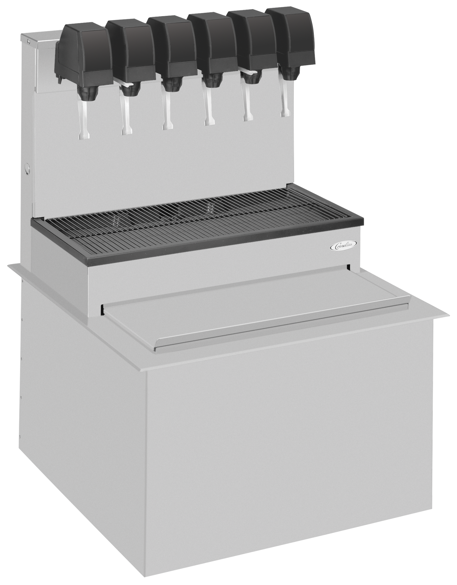 Cornelius, 631100049, CB2323 Universal Post-Mix Soda Beverage Dispenser, drop-in, ice cooled, (6) UFB-1™ lever valves, 80 lbs. ice capacity, built-in drip tray, 5-1 carb/non-carb manifold, 9-3/4" cup clearance, stainless steel tower without merchandiser, 23-1/4" x 23-1/4" cutout required, 120v/60/1-ph, 1.0 amp, UL, NSF
