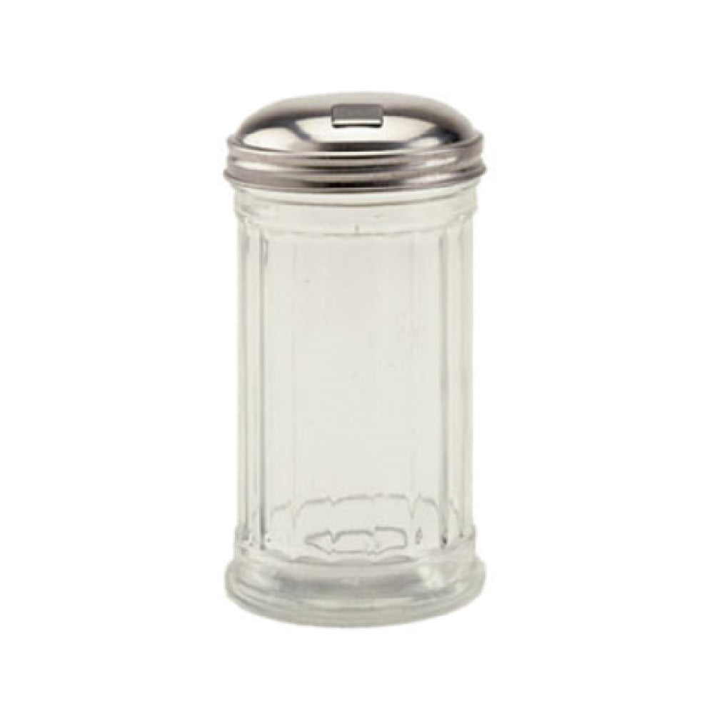 The Crestware SHKRSUGF Sugar Shaker 12 Oz. Paneled is a commercial-grade sugar dispensing accessory designed for efficient portion control in foodservice operations. Crafted from durable glass, this shaker features a 12-ounce capacity with a paneled exterior that enhances grip and ease of handling. Equipped with a flap lid for precise dispensing, it is sold exclusively in full case quantities, typically packaged as two dozen units. This product serves the hospitality, cafeteria, and catering sectors requiring reliable, uniform sugar distribution tools suited for high-volume environments.