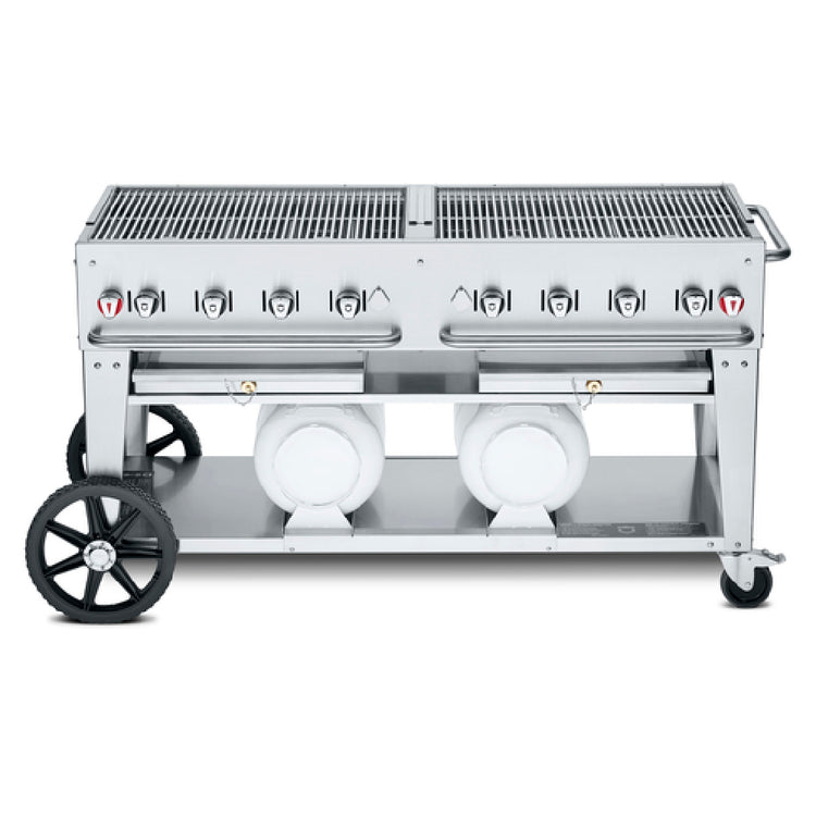Crown Verity, CV-CCB-60, Club Series Grill, LP gas, 69"L x 28"D, 8 burners, stainless steel construction, stainless steel grill, radiants, undershelf & legs, includes (2) 30 lb. horizontal propane cylinders, (2) 14" wheels & (2) total lock casters, 129,000 BTU, cETLus, ETL-Sanita