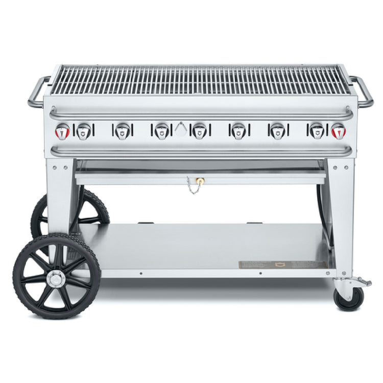 The Crown Verity CV-RCB-48-SI 50/100 Pro Series Grill offers seven independent burners with stainless steel radiants and a durable construction suitable for demanding outdoor cook areas. Its large 56-inch by 28-inch surface provides ample grilling space, with mobility features including two 14" wheels and lock casters for flexible placement. The unit's stainless steel frame ensures longevity, while the propane gas system supports high-volume cooking for commercial kitchens. Designed for ease of maintenance, it simplifies cleaning and setup for frequent use. Ideal for large-scale foodservice, it integrates seamlessly into outdoor dining or catering workflows, supporting high throughput in busy restaurant patios or catering events.