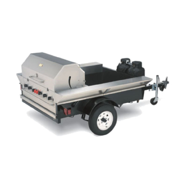 The Crown Verity CV-TG-2 Towable Grill is a commercial-grade outdoor cooking trailer designed for mobile foodservice operations and large catering events. This rugged unit features a 69" x 124" x 52" stainless steel trailer with a built-in BI-48 gas grill and RD-48 roll dome lid, providing a durable platform for high-capacity grilling. Equipped with stainless steel cooking grates, side shelves for prep and utensil storage, and capacity to hold two propane tanks, it delivers 99,000 BTU of power for efficient outdoor grilling in hospitality, food trucks, and event catering sectors. The unit’s robust construction and technical specifications support demanding operational environments, ensuring reliable performance across varied foodservice applications.