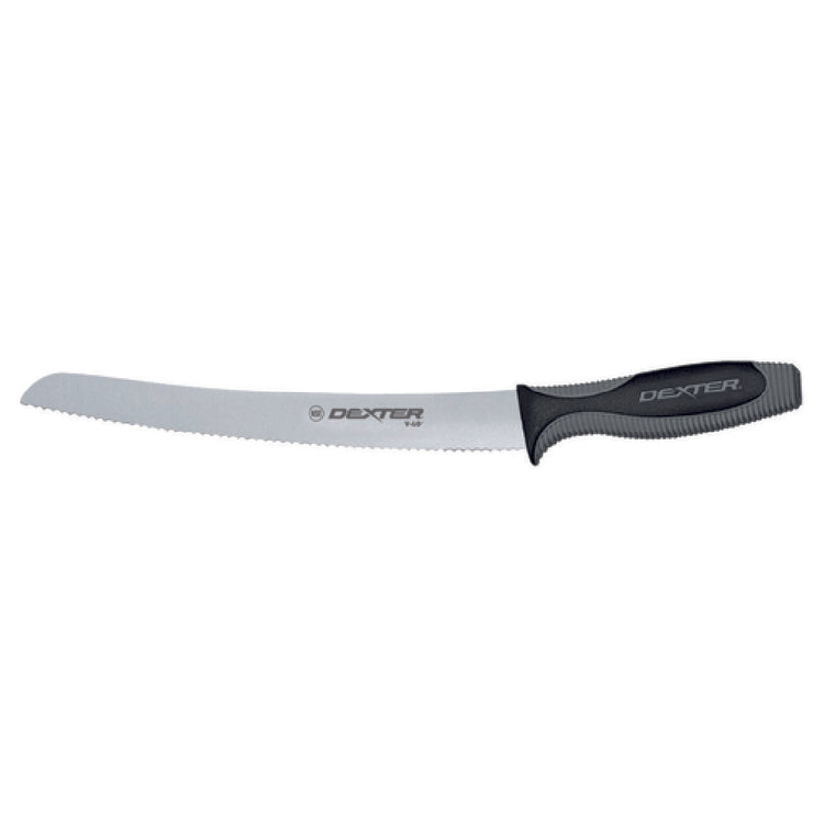 The Dexter 29333 V-Lo® (V147-10SC-PCP) Bread Knife 10" with scalloped edge is a professional-grade slicing tool designed specifically for commercial foodservice environments. Constructed from high-carbon stainless steel, the blade provides exceptional edge retention and corrosion resistance, making it ideal for bakery, deli, and restaurant operations. Its scalloped blade facilitates clean, effortless cuts through bread and baked goods, while the soft-to-the-touch handle ensures comfortable, prolonged use. This bread knife's durable design and precise craftsmanship make it suitable for high-volume slicing tasks, optimizing workflow efficiency in busy kitchen settings.