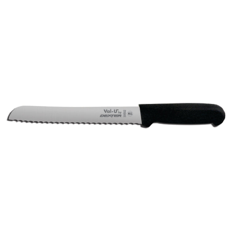 The Dexter Russell 30502 Val-U™ (30502) Bread Knife with an 8-inch high carbon steel blade is a professional-grade cutting tool designed for precise slicing of bread and baked goods in commercial kitchens. Crafted with a stamped, scalloped edge, this bread knife offers enhanced cutting performance by reducing tearing and crushing of delicate bread loaves. Its stain-free DEXSTEEL™ high carbon steel construction ensures durability and long-lasting edge retention, making it an essential piece of equipment for high-volume foodservice operations. The ergonomic handle features a black polypropylene material with a finger guard, providing safety and comfort during extended use. This NSF-listed bread knife is engineered for reliability and ease of maintenance, supporting efficient workflow in bakery, deli, or restaurant applications.