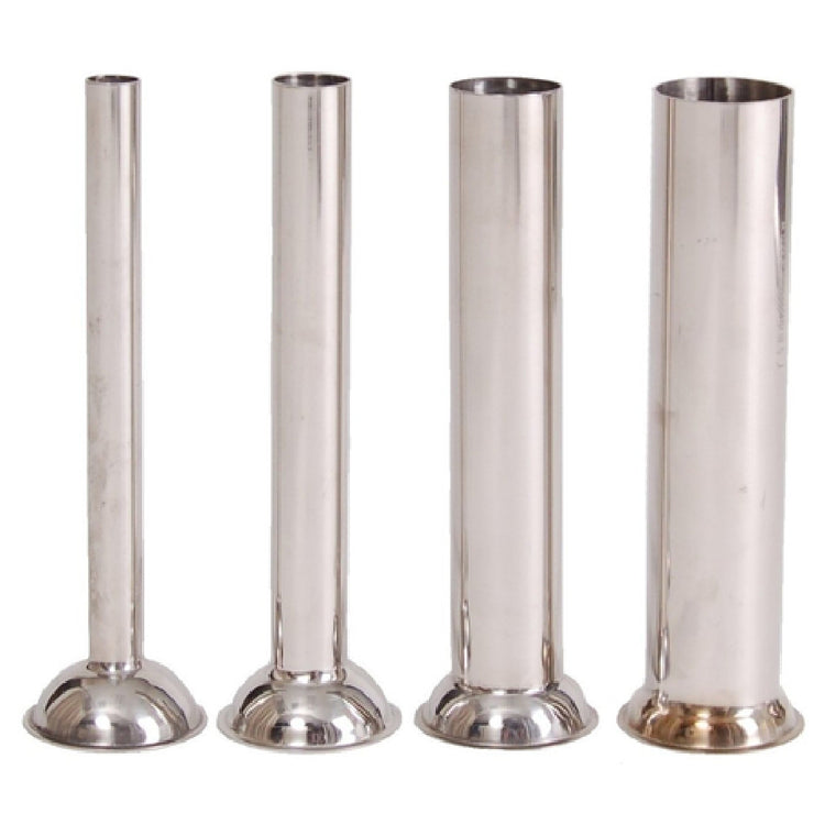 A commercial sausage stuffing tube is a specialized tool used in meat processing to fill casings with ground or chopped sausage mix. Made from durable materials like stainless steel, these tubes are designed for high-volume use in commercial kitchens, butcher shops, and sausage production facilities. They connect directly to sausage stuffer machinery, such as USSC-DL and USSC-SH models, ensuring precise and uniform stuffing. Uniworld Food Service Equipment DL-P05 sausage tubes are set of four, supporting continuous operation in mid-volume and high-capacity food processing environments, perfect for consistent product quality in sausage manufacturing operations.