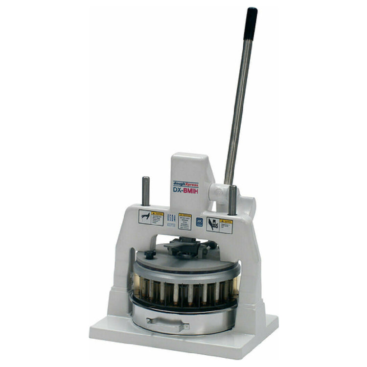 The DoughXpress BakeryXpress Dough Divider features a straightforward countertop design, with a weight of 106 lbs optimized for stability during operation. Crafted in the USA, it features a stainless steel body resistant to wear and easy cleaning. The model includes UL® certification for safety compliance and is powered manually, reducing energy consumption. Its operation accommodates dough portions ranging from 2 ounces up to 9 ounces, with a 24-hour production capacity suited for moderate throughput environments. The unit's dimensions are engineered for ergonomic handling, supporting efficient division in compact commercial kitchens. Maintenance involves simple disassembly for cleaning, utilizing standard tools, with no need for electrical connections or external refrigeration, as it is solely powered by manual force.