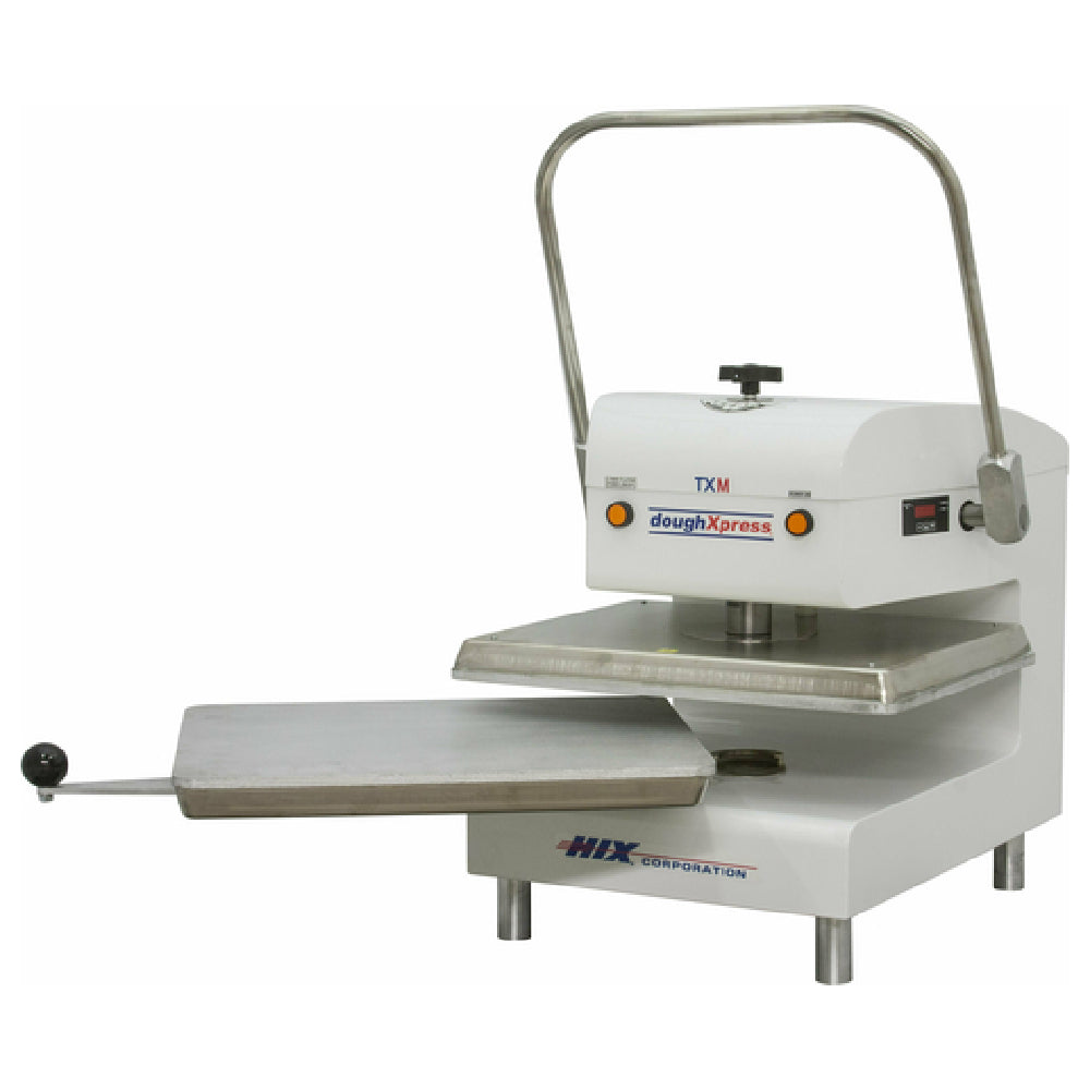 The DoughXpress TXM-W (11217) Tortilla Dough Press is a commercial-grade manual dough pressing solution designed for high-volume foodservice operations. Equipped with two 16" x 20" heated aluminum platens, this equipment ensures precise heat transfer and uniform pressing, making it ideal for preparing large quantities of tortillas efficiently. Featuring a swing-away design for easy maintenance and accessibility, it is suitable for bustling bakeries, restaurants, and industrial kitchens seeking consistent dough quality. The digital timer and temperature controls facilitate accurate operation, while full-range thickness adjustment up to 7/8" supports various product specifications. Constructed with durable, corrosion-resistant materials, this unit is engineered for reliable, long-term performance in demanding culinary environments.