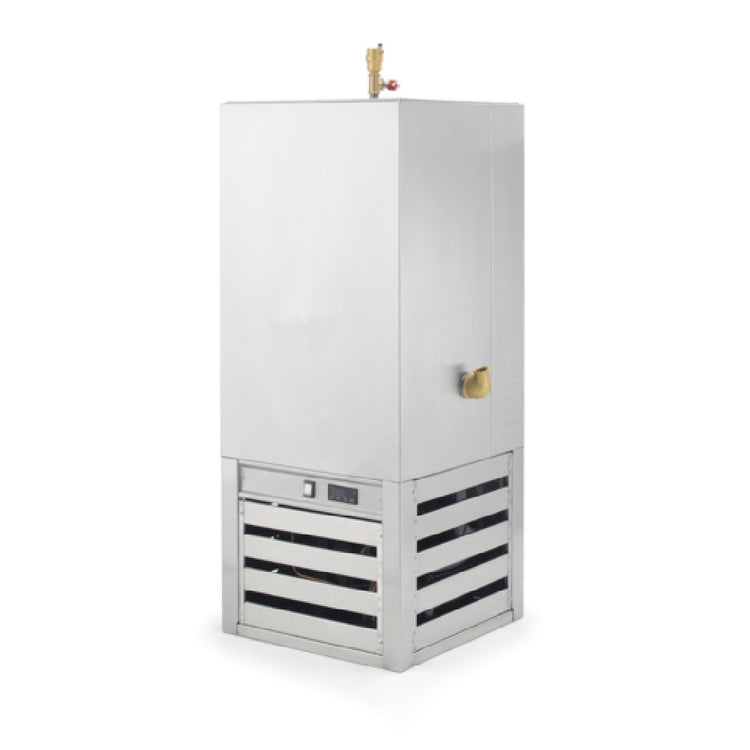 A commercial water chiller is a refrigeration device designed for precise cooling of water in foodservice and hospitality environments. The Doyon RAF100 water chiller combines a high-capacity, self-contained refrigeration system with durable construction, enabling consistent delivery of chilled water at 2°C (36°F). Installed in kitchens, beverage stations, or catering setups, it supports moderate water cooling needs for preparing beverages, maintaining ingredient temperatures, or process workflows. Its technical specifications, including a 100-liter capacity, stainless steel tank, and energy-efficient compressor, make it suitable for mid-volume foodservice operations requiring reliable temperature control and efficient water circulation.