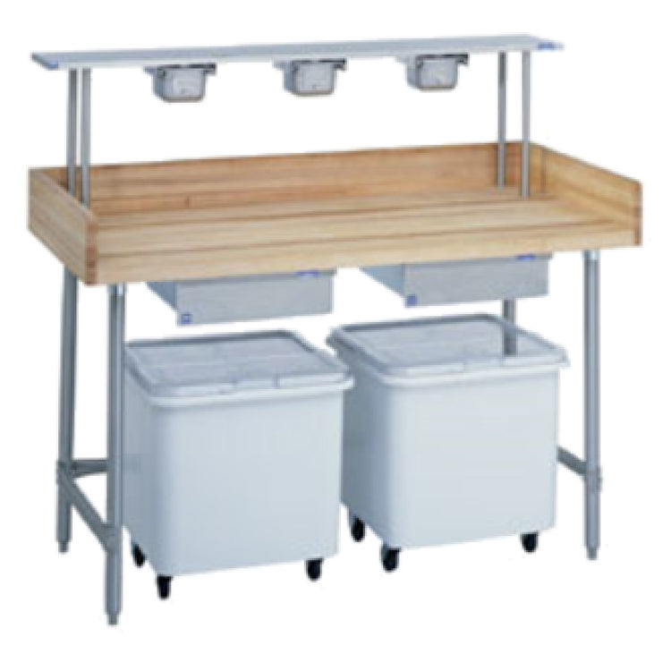 Duke Manufacturing, 335, Bakers Table, 1-3/4" thick laminated maple top, 30" wide top, with splash at rear & both sides, 60" long, open base, with (2) ingredient bins, (2) drawers, centered, stainless legs & cross braces, NSF
