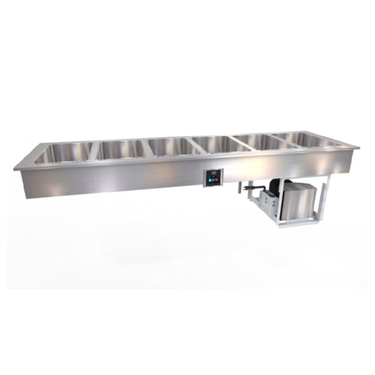 The Duke FCP6-SB Flush Mount Cold Pan Unit is a commercial-grade refrigerated food well designed for precise temperature control and efficient workflow in high-volume foodservice operations. This drop-in refrigerated unit measures 88-13/16 inches wide by 26 inches deep and stands 24 inches high, integrating six full-size (12" x 20") food pans with touchscreen control for easy operation. Built with insulated stainless steel construction and self-contained refrigeration, it ensures consistent cold storage and food presentation. Its design facilitates straightforward installation and maintenance, making it ideal for mid-volume restaurant kitchens, buffet lines, and catering setups requiring reliable, accessible cold food storage solutions.