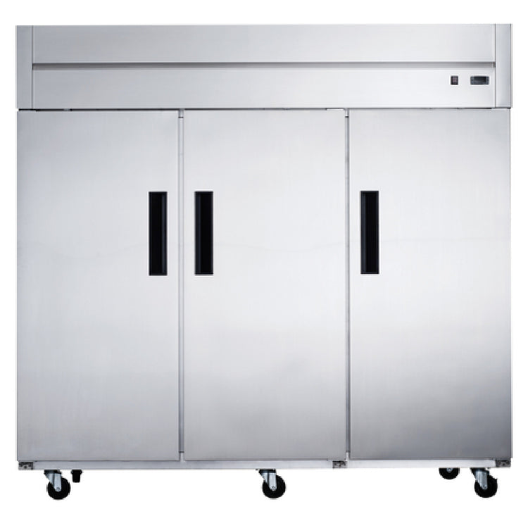 Dukers Appliance Co., USA Ltd., D83AR, Refrigerator, reach-in, three-section, top mount self-contained refrigeration, digital temperature control, 33°F (0.5°C) to 41°F (5°C) temperature range, automatic defrost, (3) solid self-closing doors, adjustable shelves, stainless steel interior & exterior, 5" casters (2 braked), R290 refrigerant, 1 HP, 115v/60/1-ph, 8.6 amps, NEMA 5-20P, cETLus, ETL-Sanitation